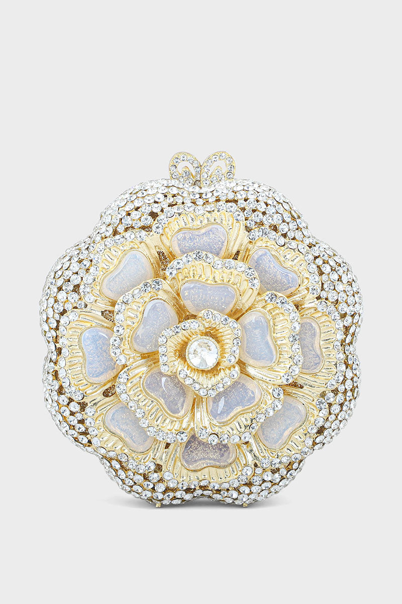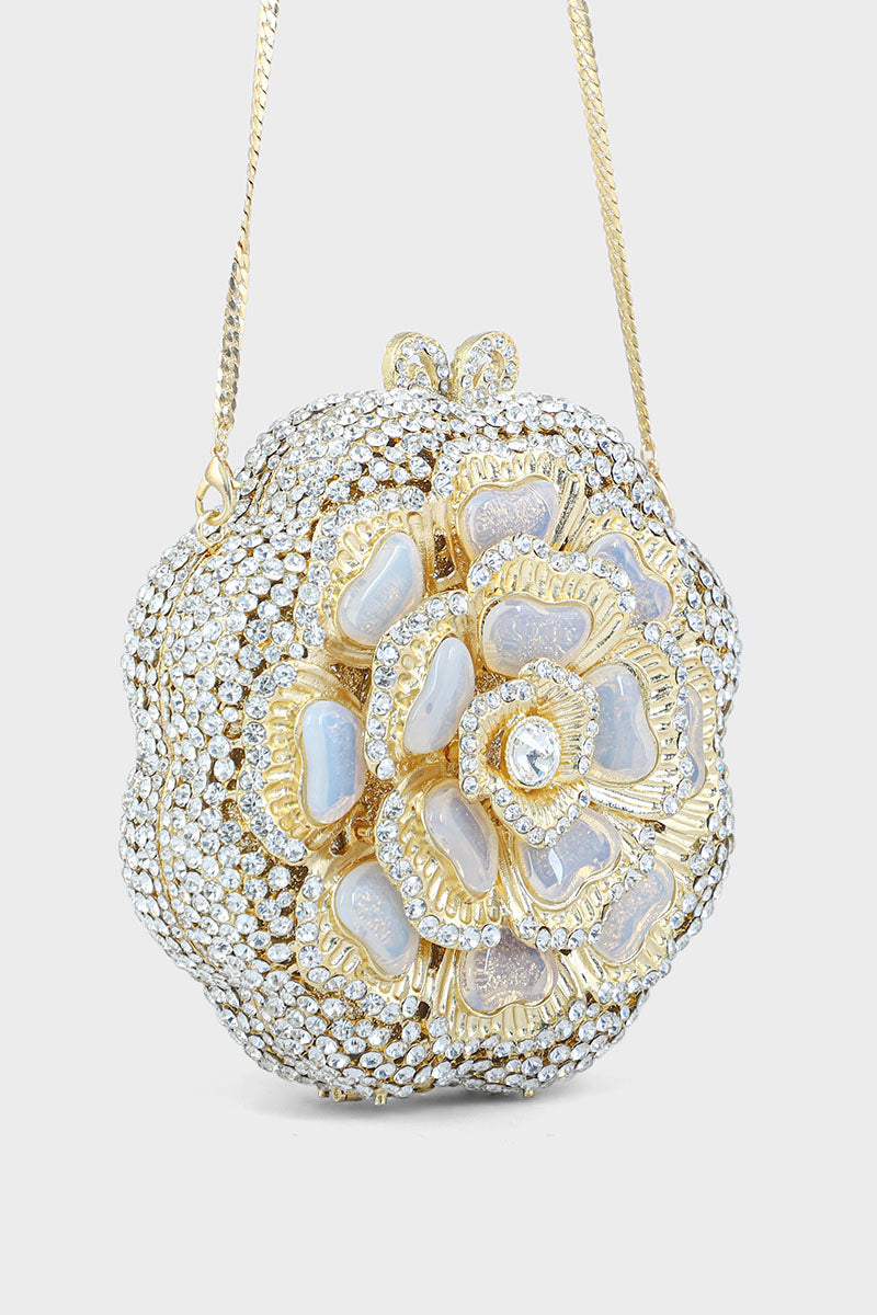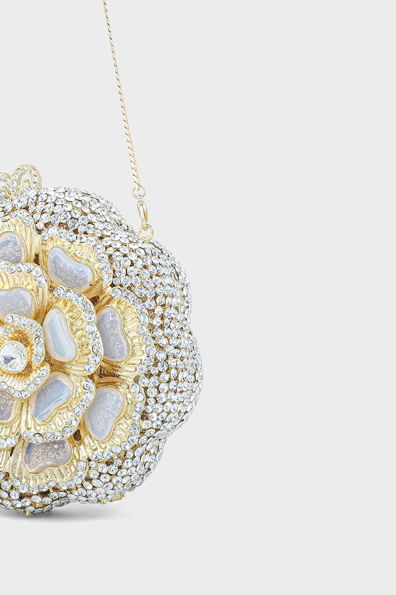 Elegant golden party wear clutch with a stylish design and shimmering finish, perfect for a glamorous and sophisticated look.