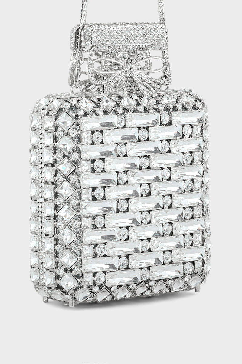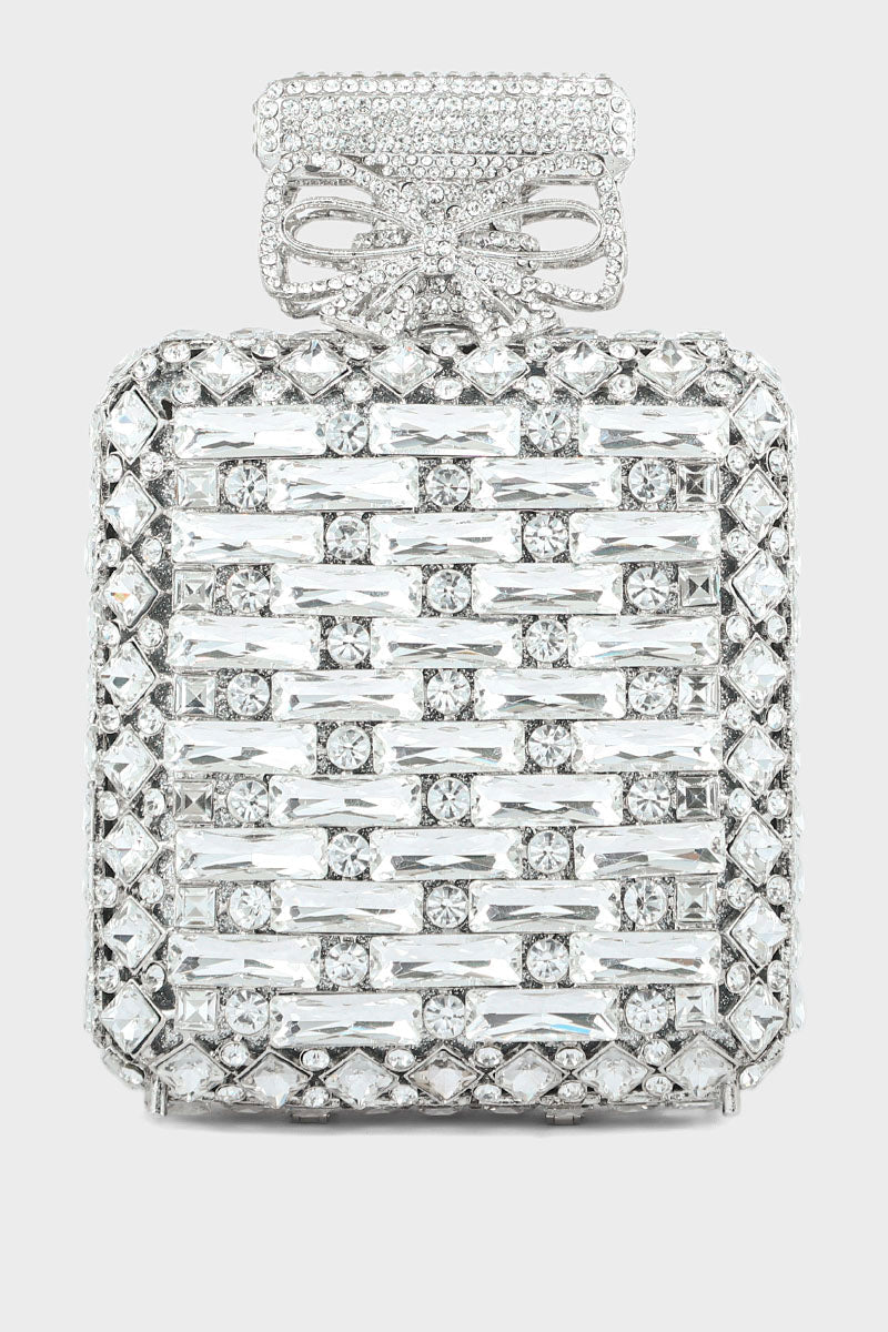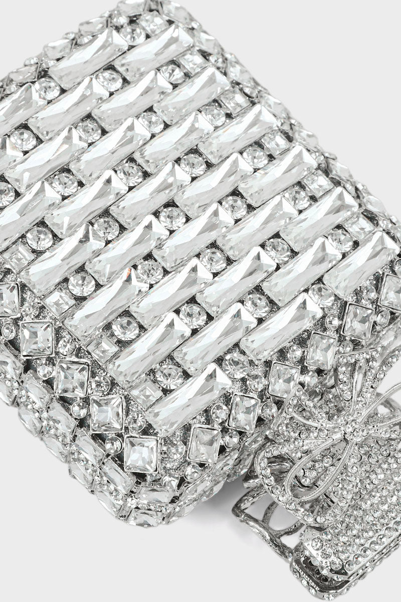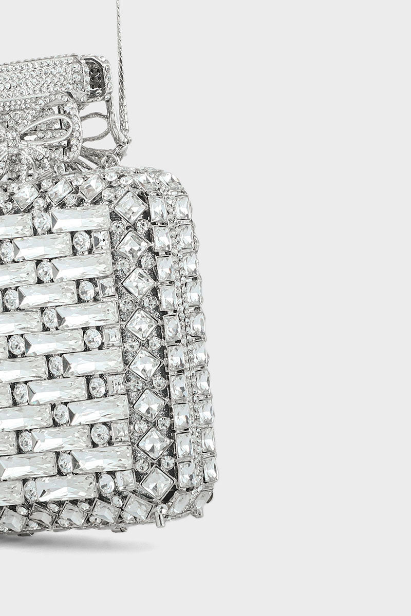 Glamorous silver party wear clutch with a sleek design and shimmering finish, perfect for an elegant and sophisticated look.