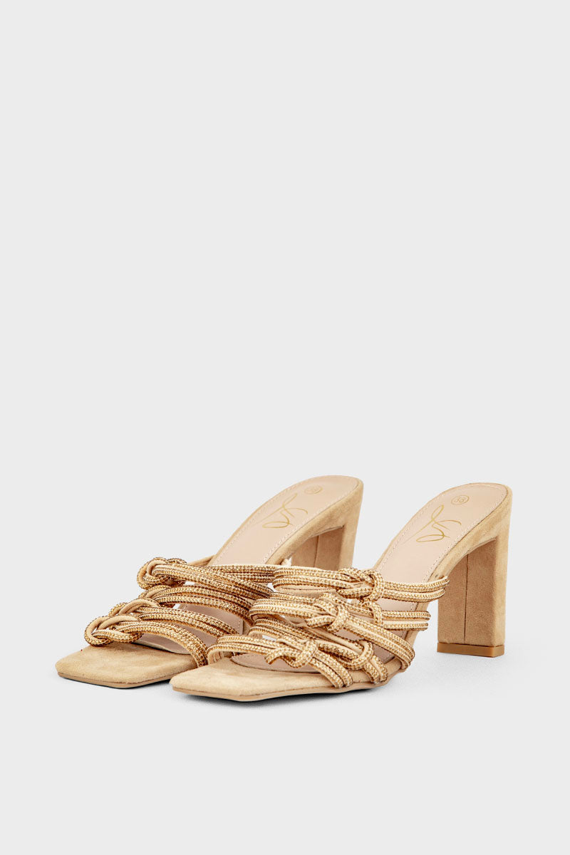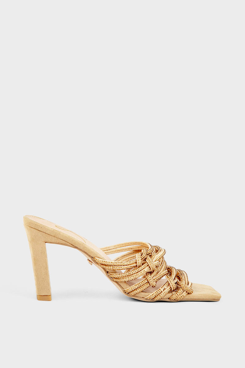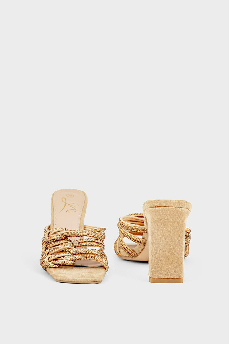 Elegant golden party wear slip-on with a shimmering finish and stylish design, perfect for a glamorous and sophisticated look.