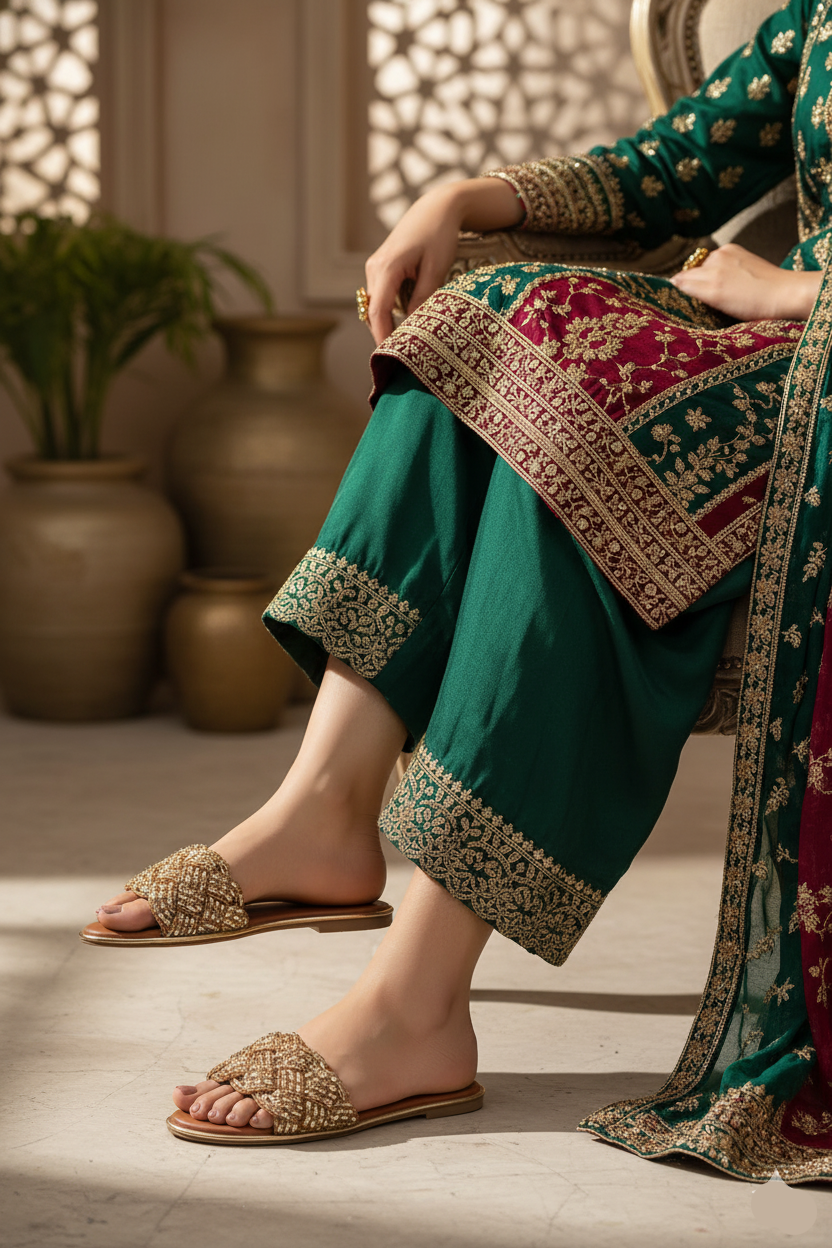 Description: Brown color, made of PU with a studded weaved upper, designed as a round toe slip on with a gold welt outsole for a trendy yet comfortable fit.