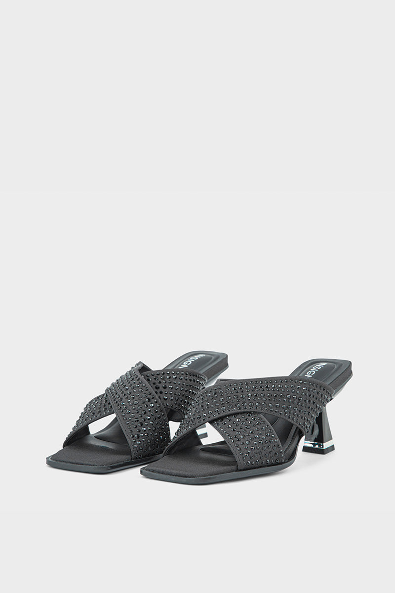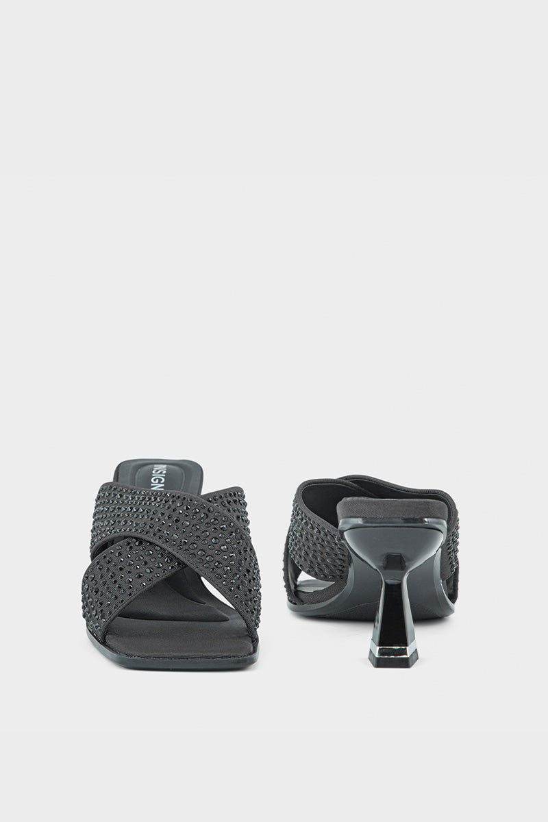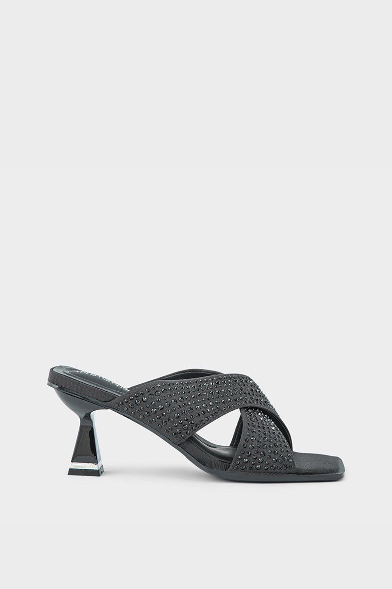 Material: PU with stones Heel Height: 2.5 inches Style: Square Toe Pu Slip on Cross strap stone embellished heel