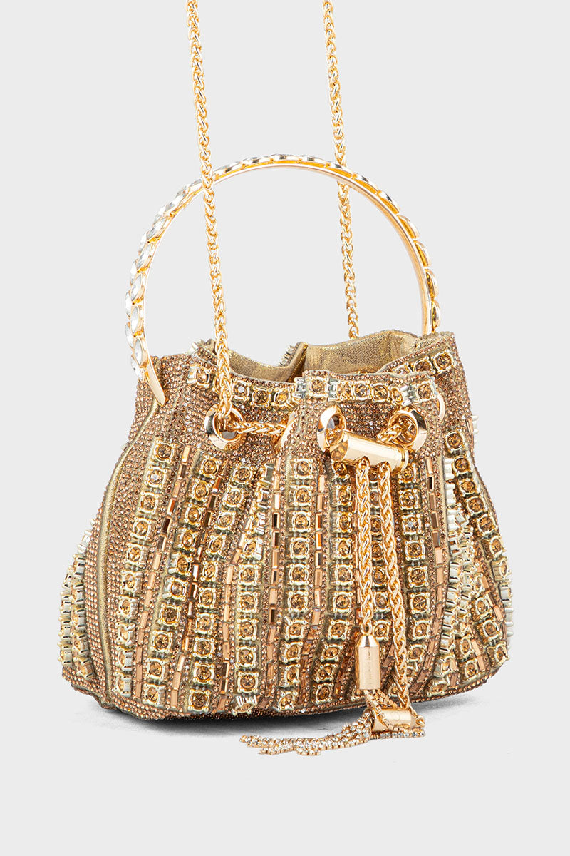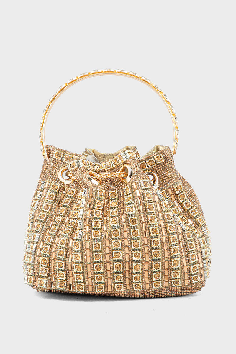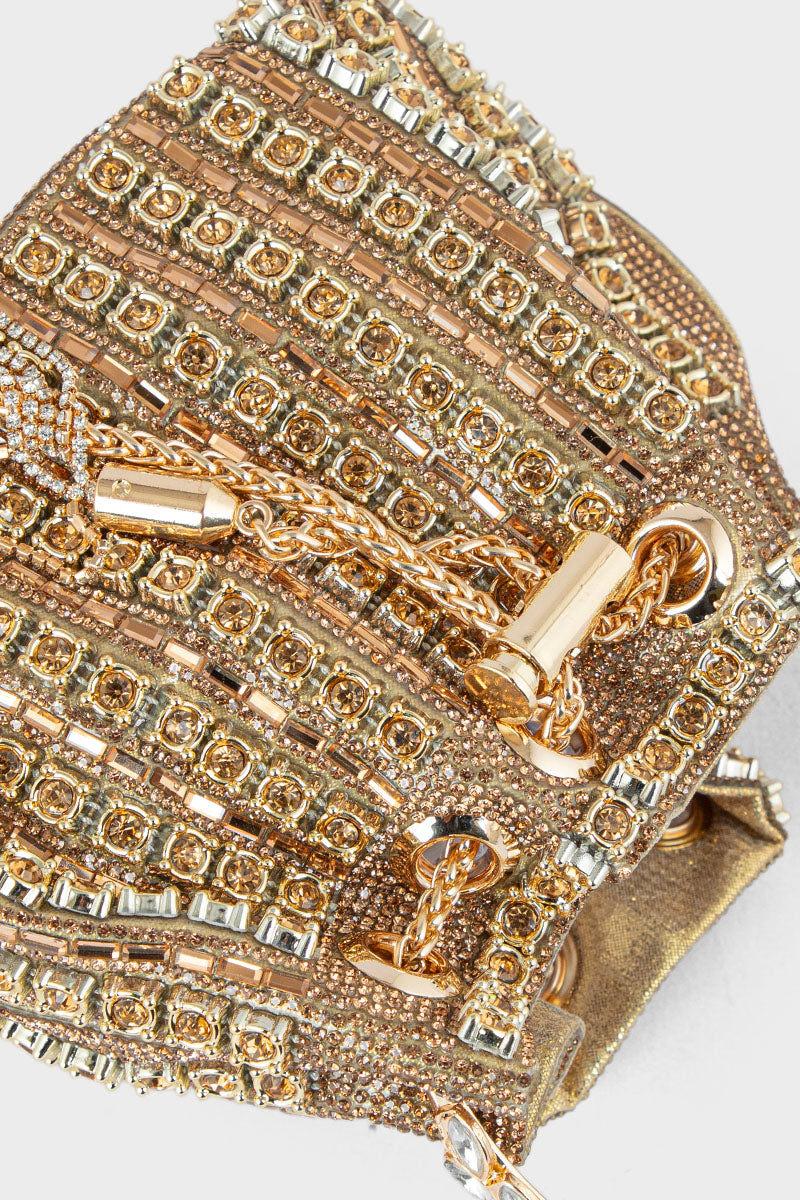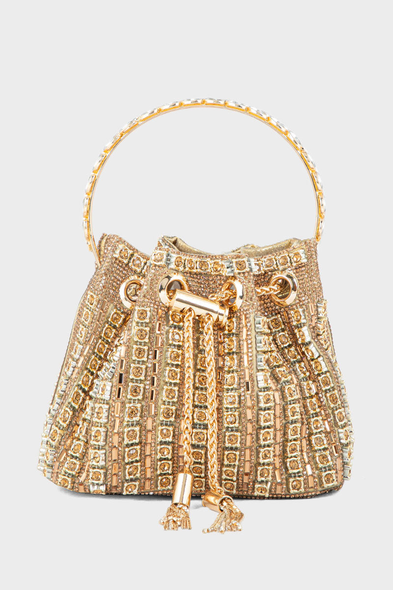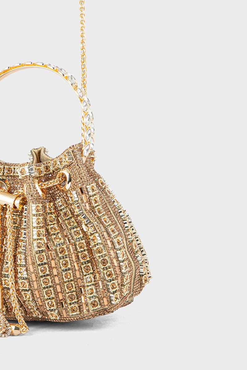 Chic golden pouch clutch with a sleek design and shimmering finish, perfect for an elegant and glamorous look.
