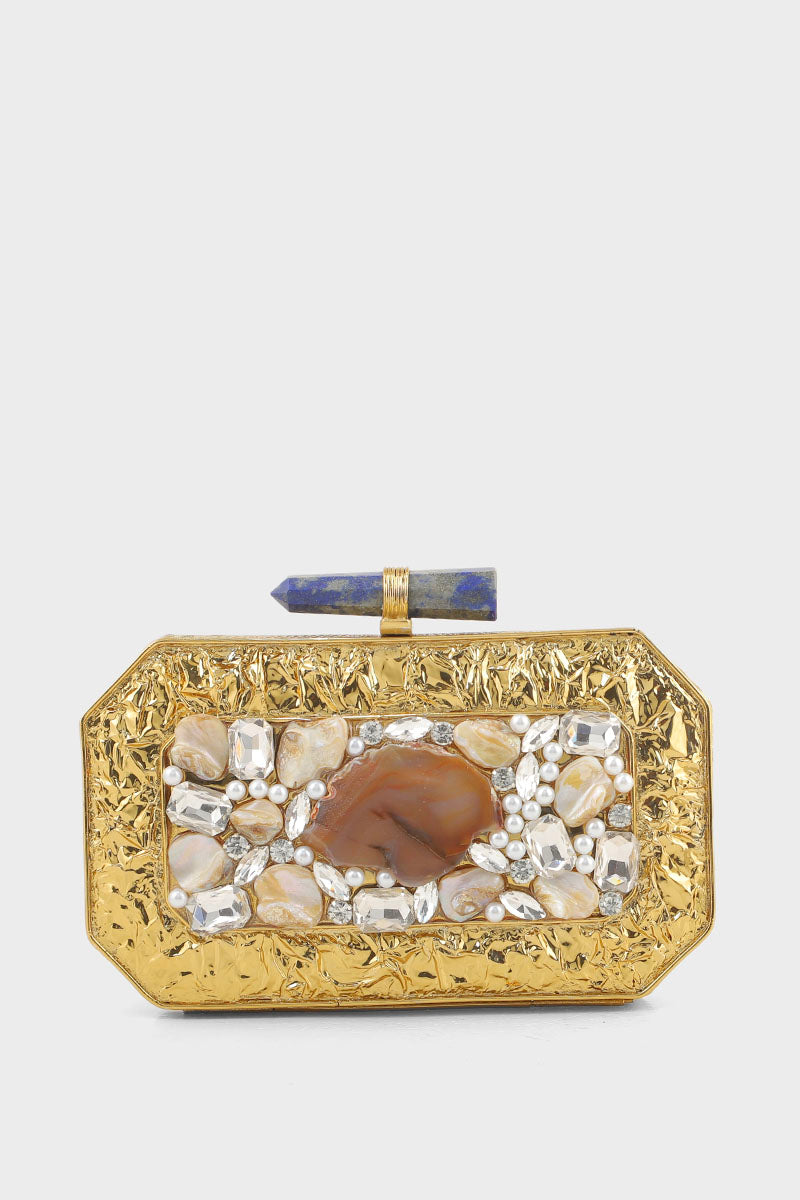 Add a regal touch to your wedding ensemble with this golden clutch, designed to capture attention and radiate elegance