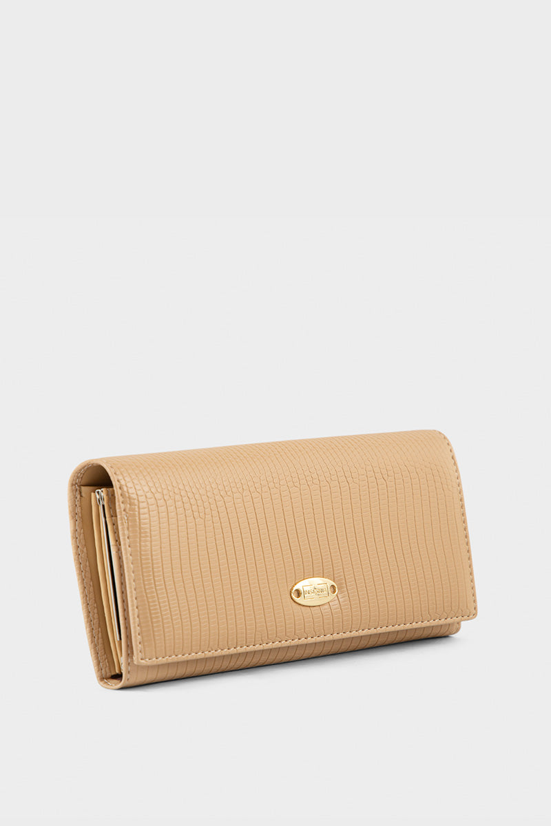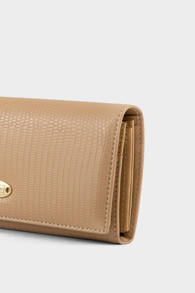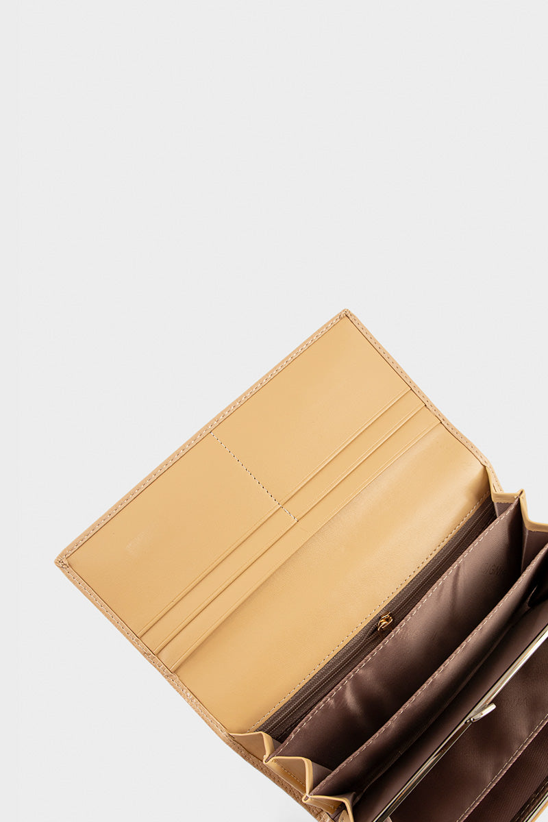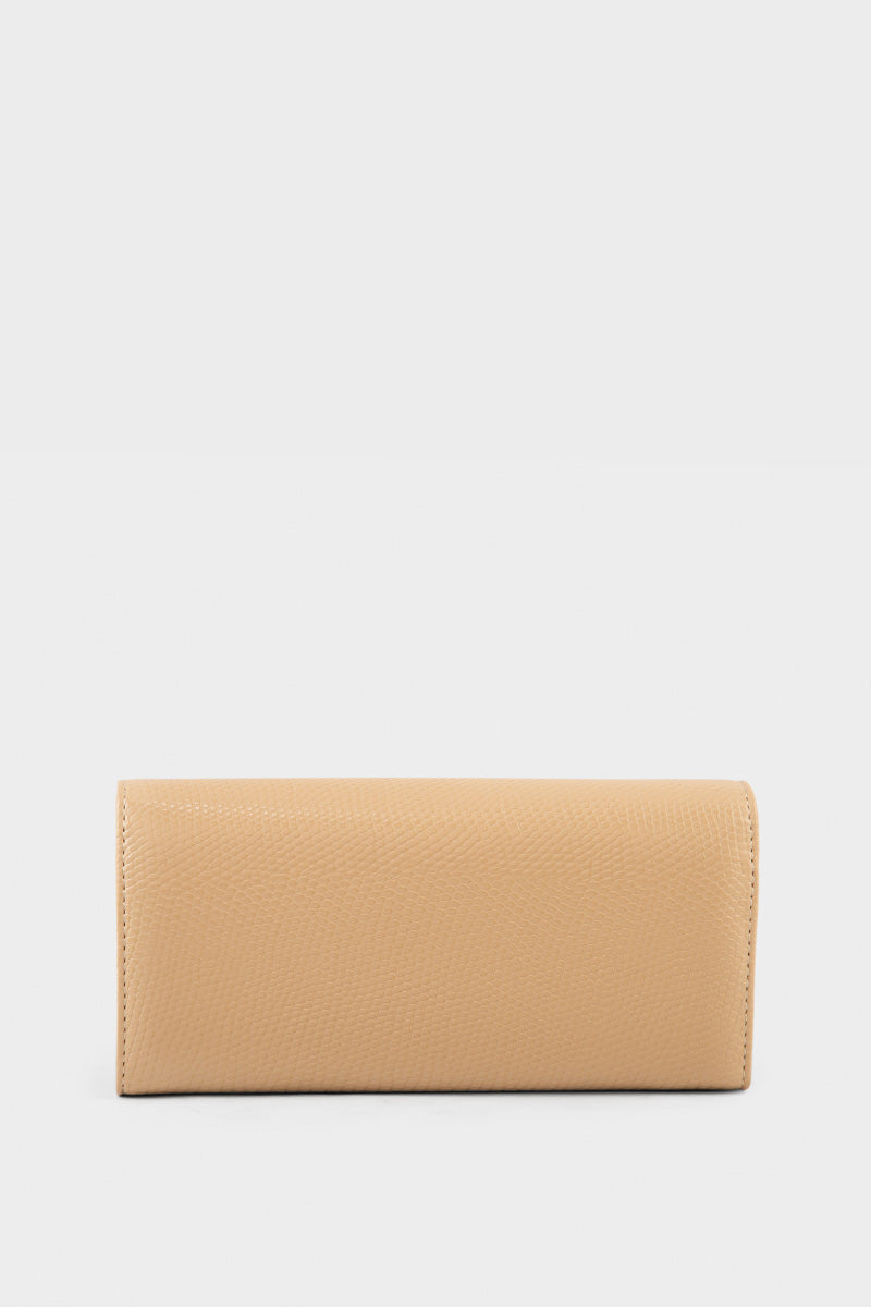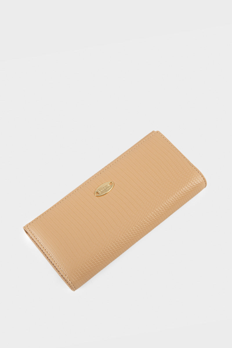 Description: Compact beige wristlet wallet combining convenience with a sleek design